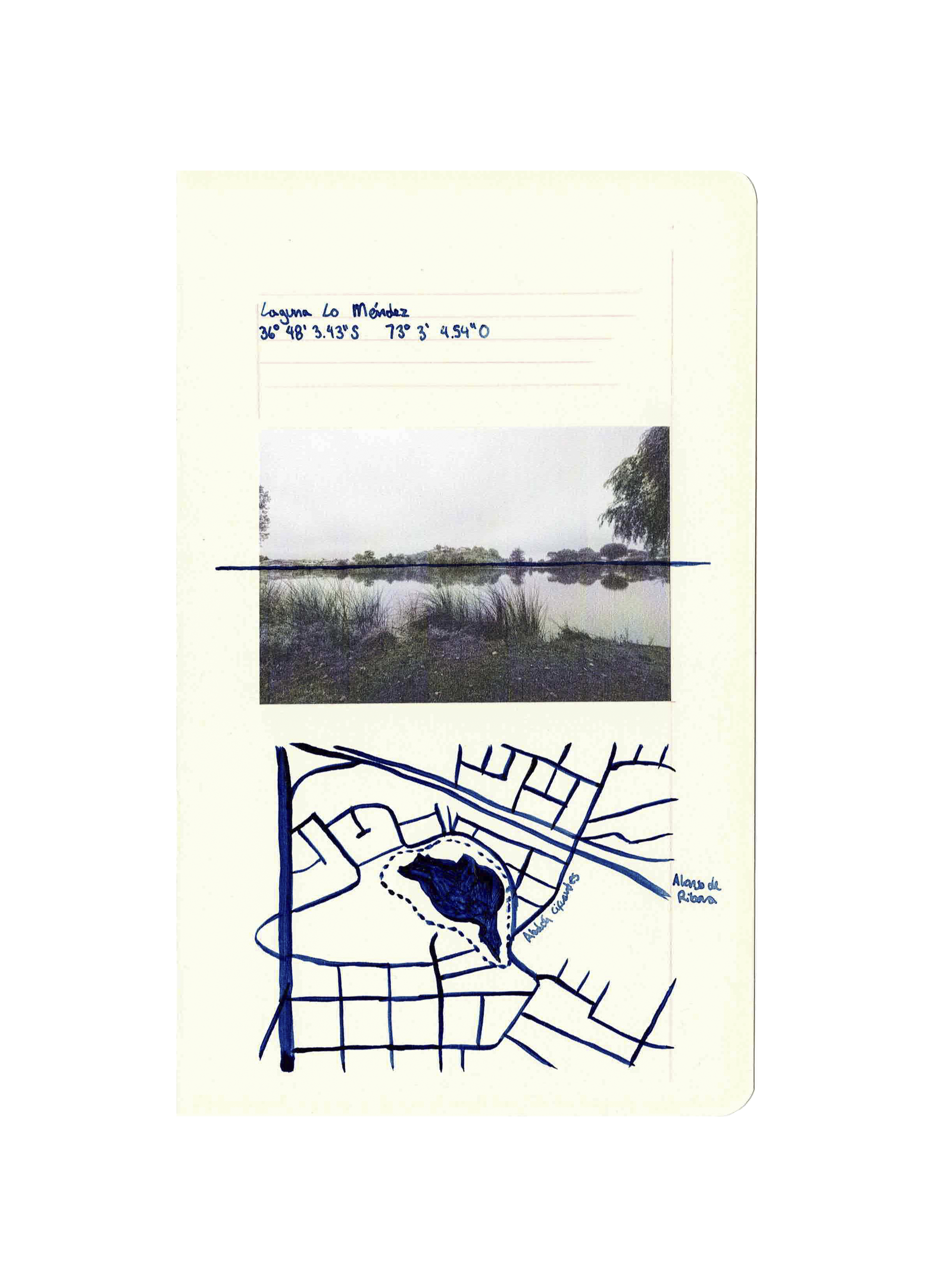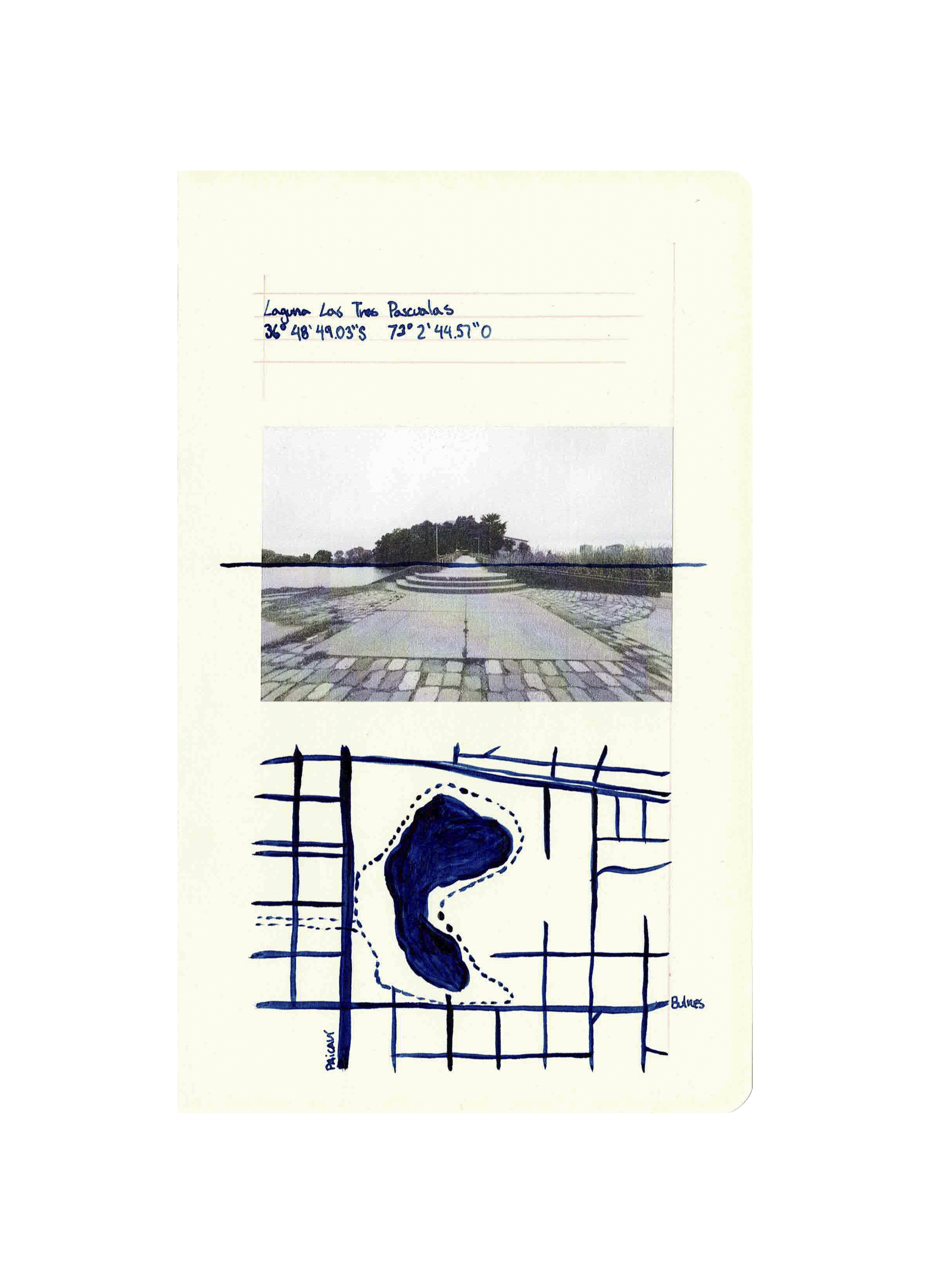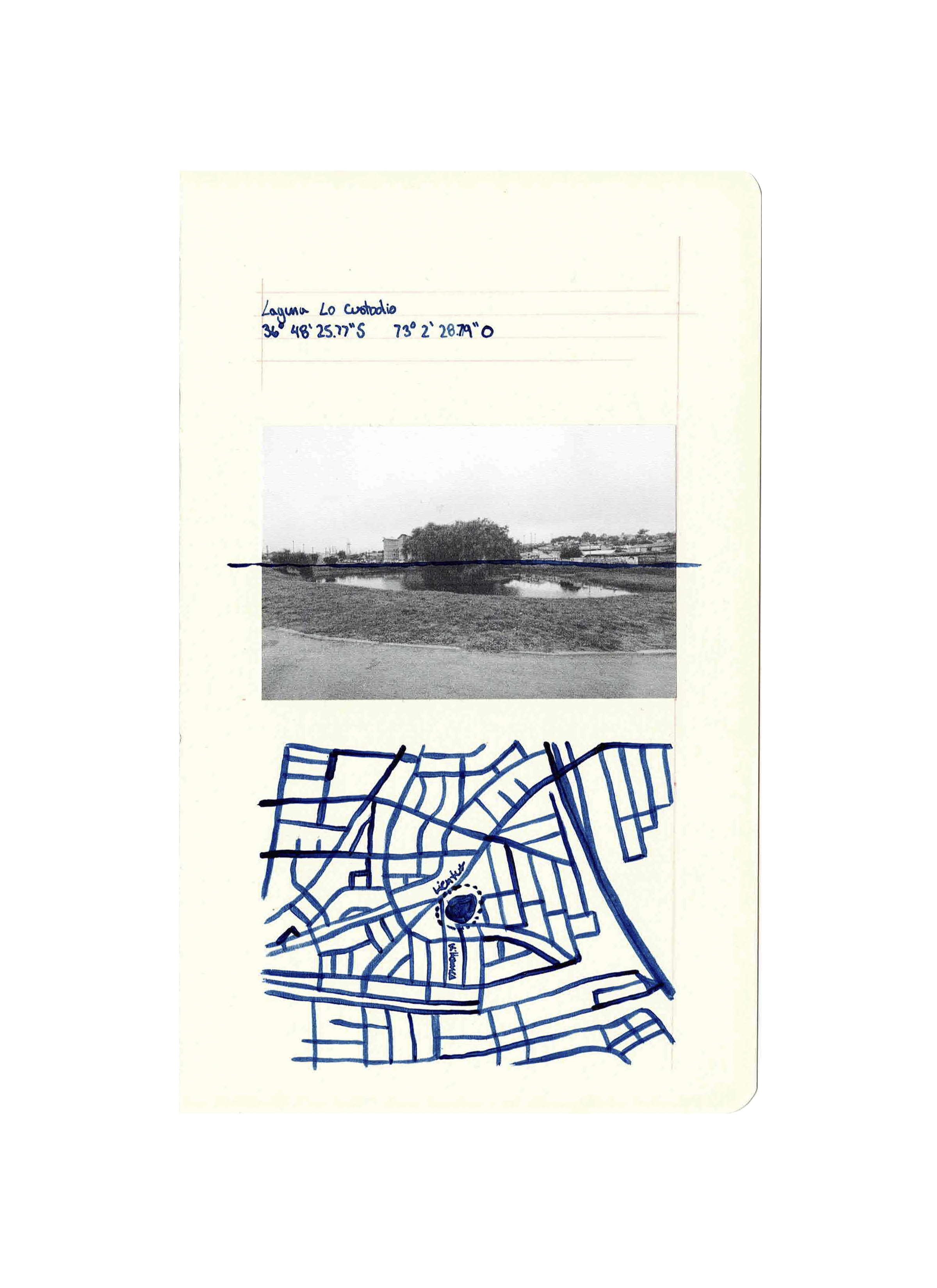 Lagunas (Fondart 2021) rescata la hidrografía primigenia del Valle de la Mocha al intervenir imágenes actuales con las referencias de los cuerpos de agua registrados en los mapas históricos (1752-1895), materializando el sustrato físico del paisaje, cuestionando cómo el desarrollo urbano ha alterado elementos identitarios. En contrapunto