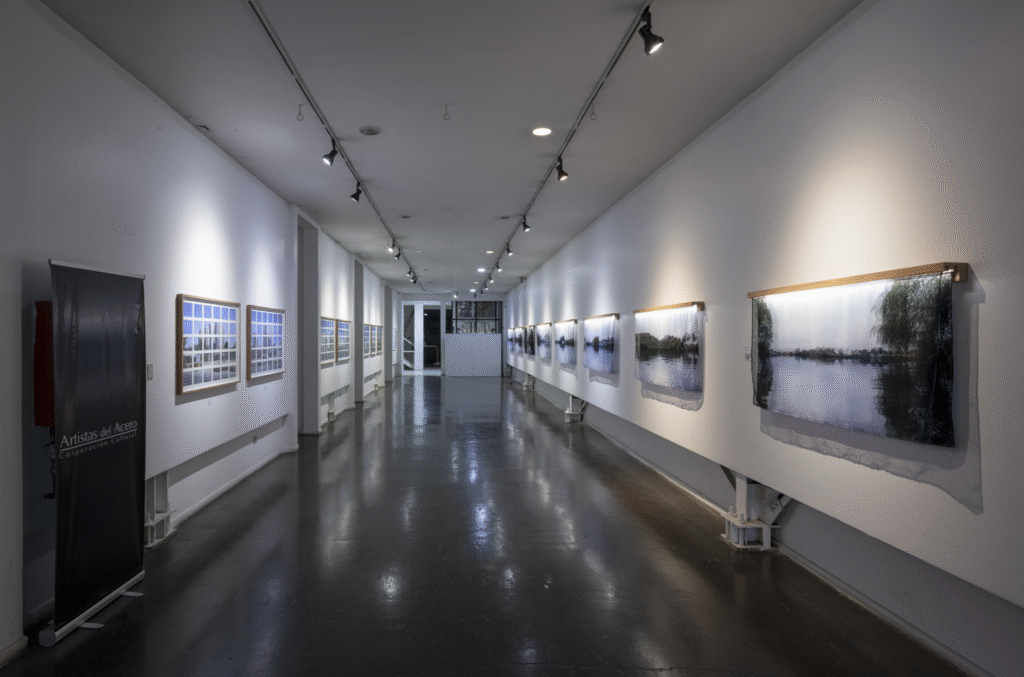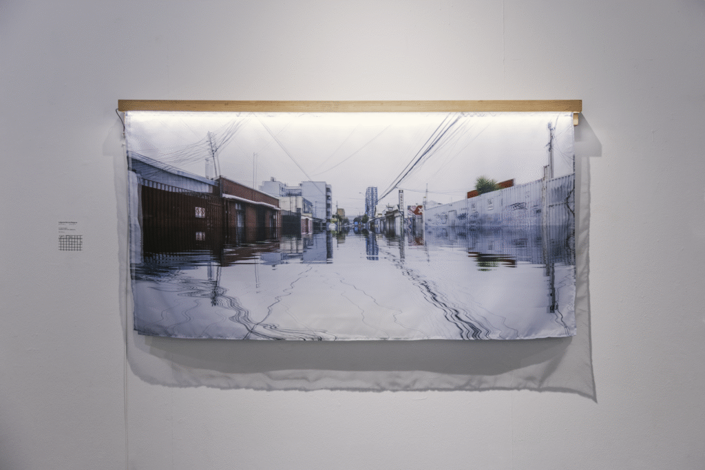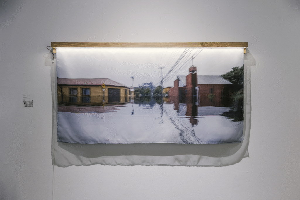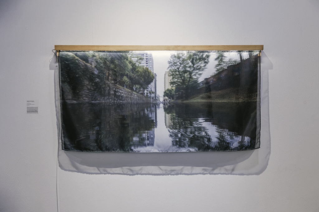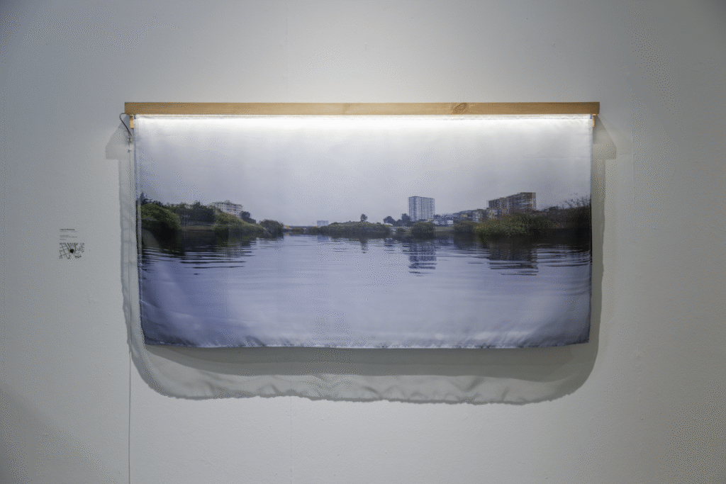 La primera serie, “Lagunas / Memoria hídrica del paisaje de Concepción” (Fondart 2021), rescata la historia de los cuerpos de agua primigenios del Valle de la Mocha, evidenciando su desaparición y el conflicto entre el desarrollo urbano y la preservación del entorno natural. A través de fotomontajes, se reintegran los cuerpos de agua a su ubicación inicial y se incrementa el volumen de aquellos que aún permanecen en la ciudad, creando imágenes evocativas que dialogan con la memoria del paisaje.