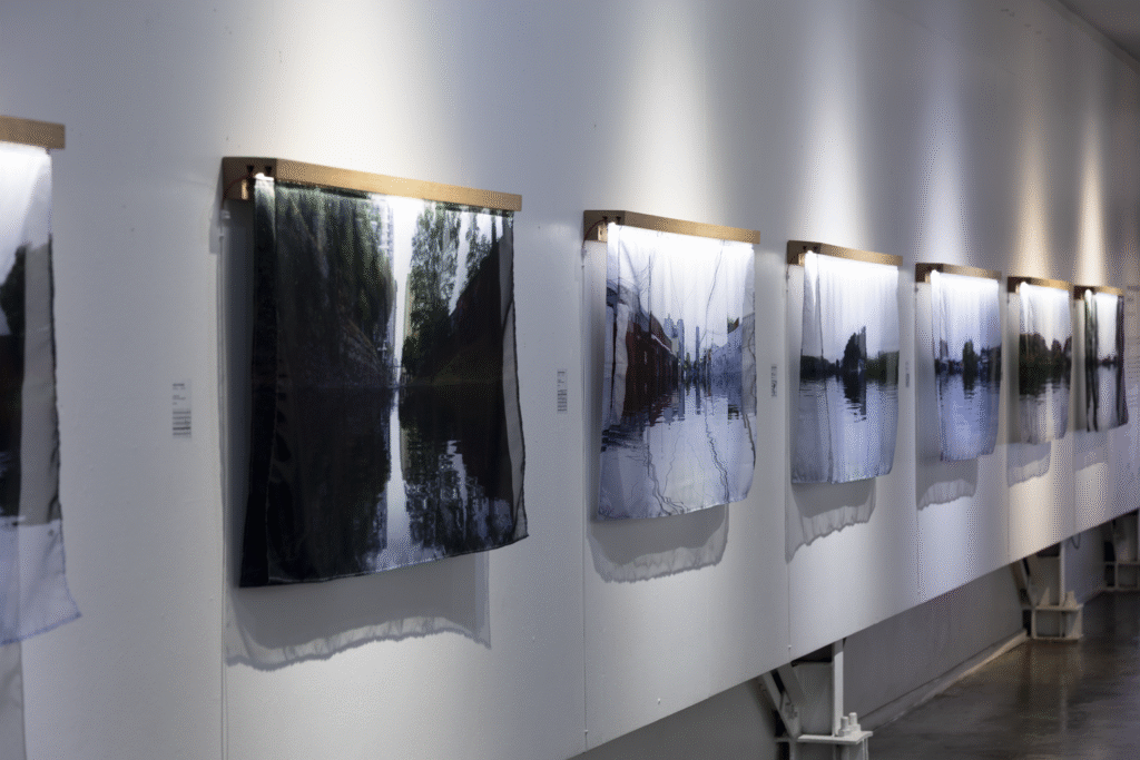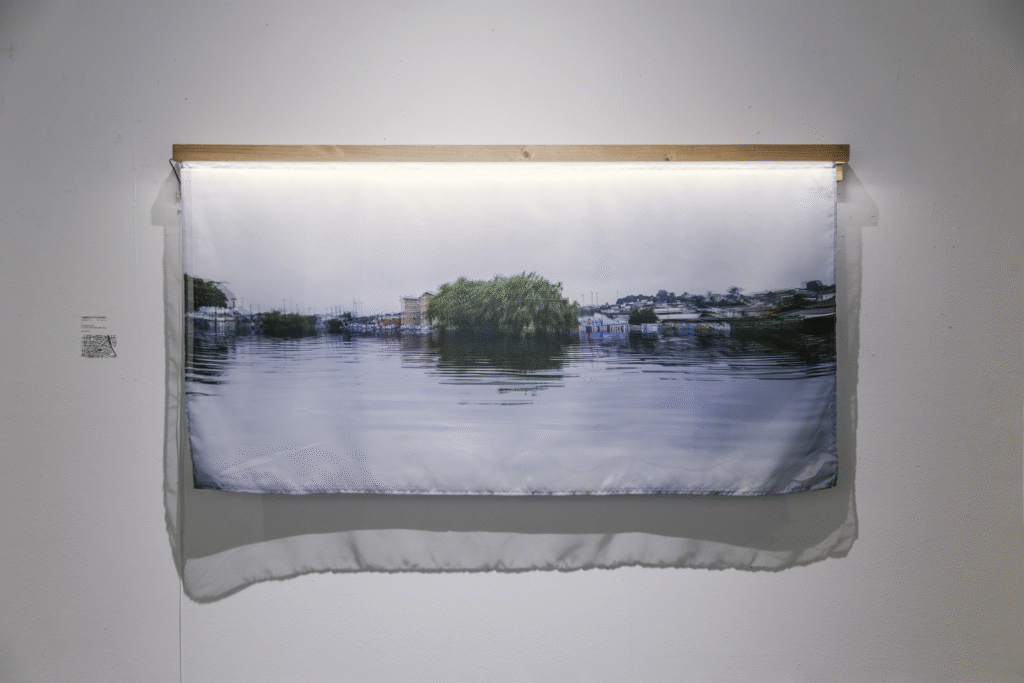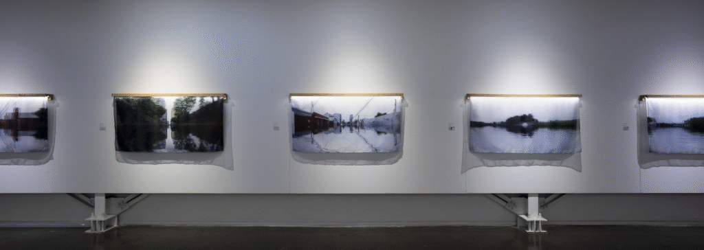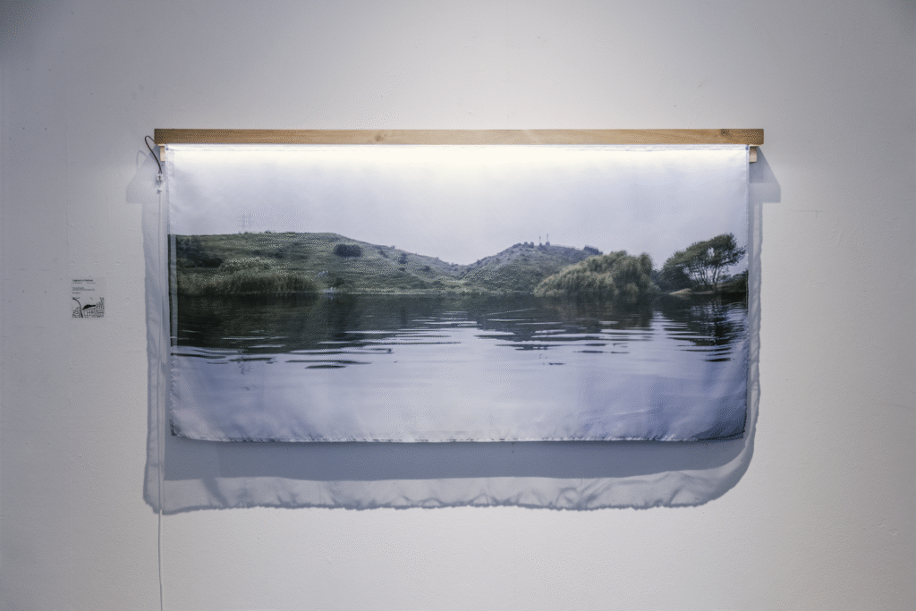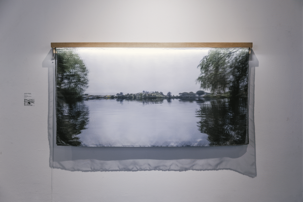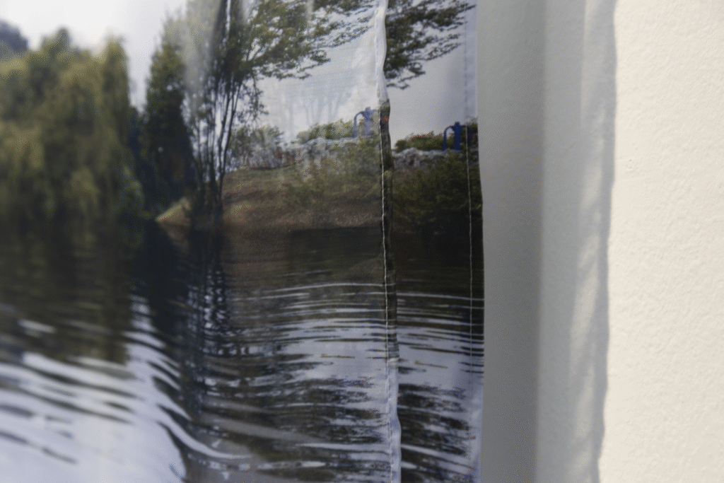 La primera serie, “Lagunas / Memoria hídrica del paisaje de Concepción” (Fondart 2021), rescata la historia de los cuerpos de agua primigenios del Valle de la Mocha, evidenciando su desaparición y el conflicto entre el desarrollo urbano y la preservación del entorno natural. A través de fotomontajes, se reintegran los cuerpos de agua a su ubicación inicial y se incrementa el volumen de aquellos que aún permanecen en la ciudad, creando imágenes evocativas que dialogan con la memoria del paisaje.